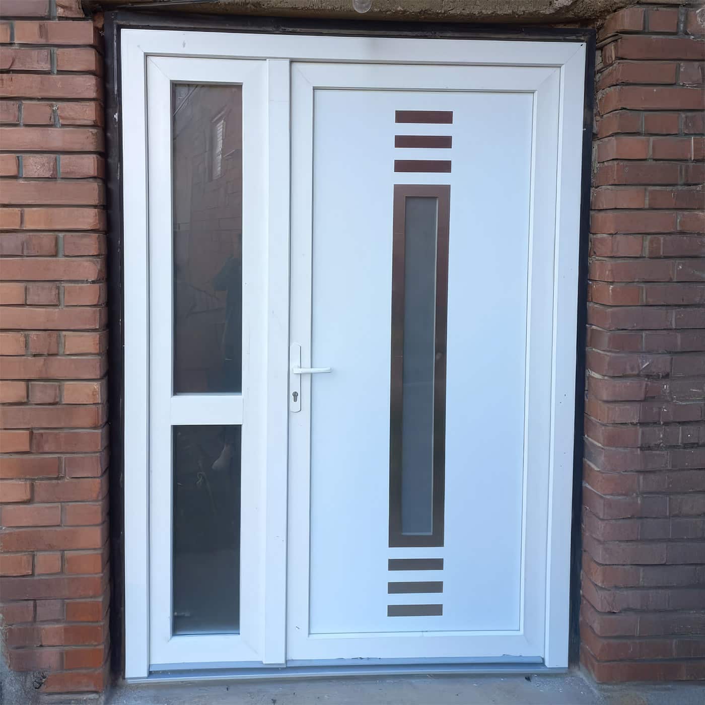 Ova konfiguracija PVC ulaznih vrata Inoutic Deceuninck kombinuje dvokrilna vrata sa fiksnim delom, čime se postiže veći svetli otvor uz zadržavanje stabilnosti sistema. PVC materijal obezbeđuje dobru termoizolaciju i otpornost na spoljašnje uticaje.