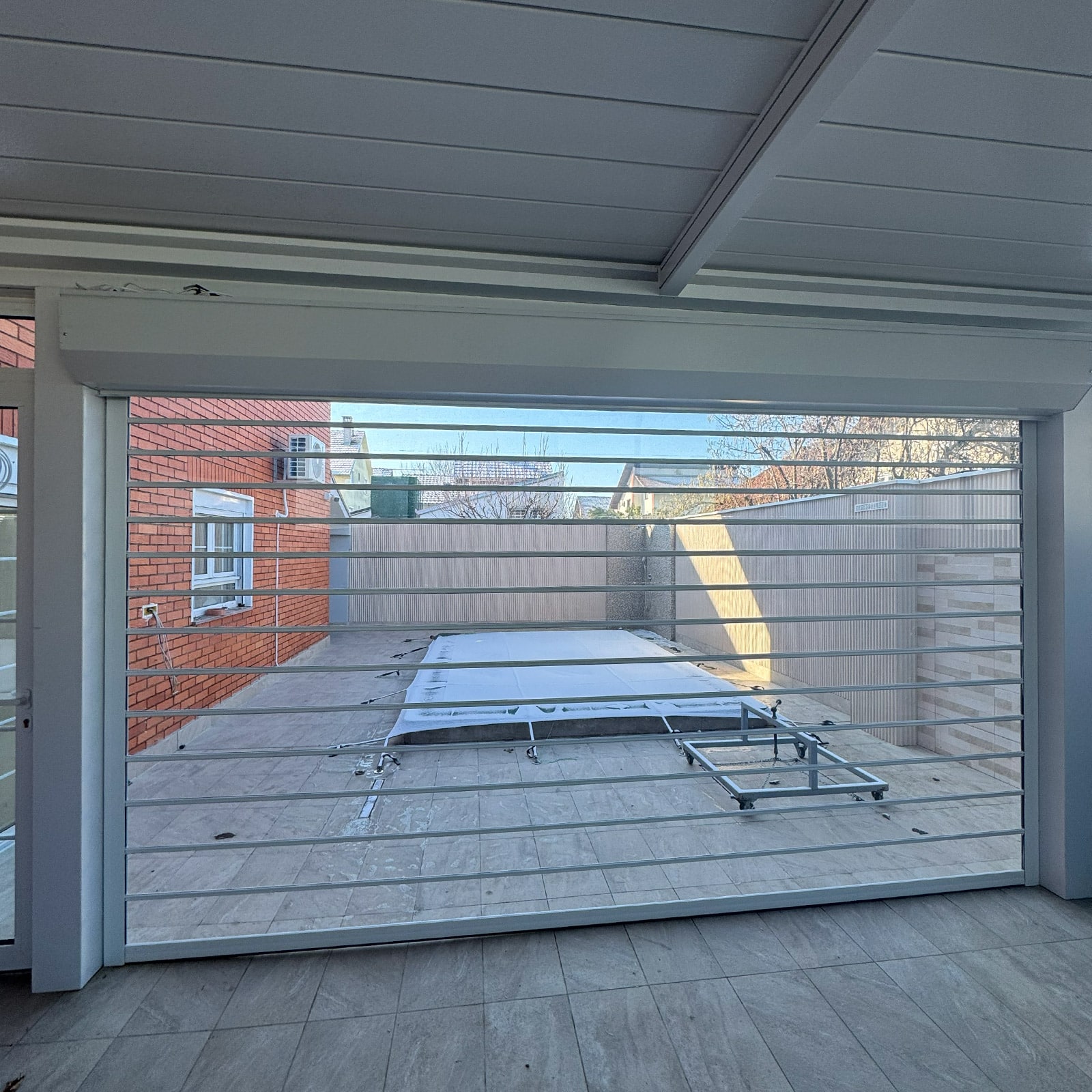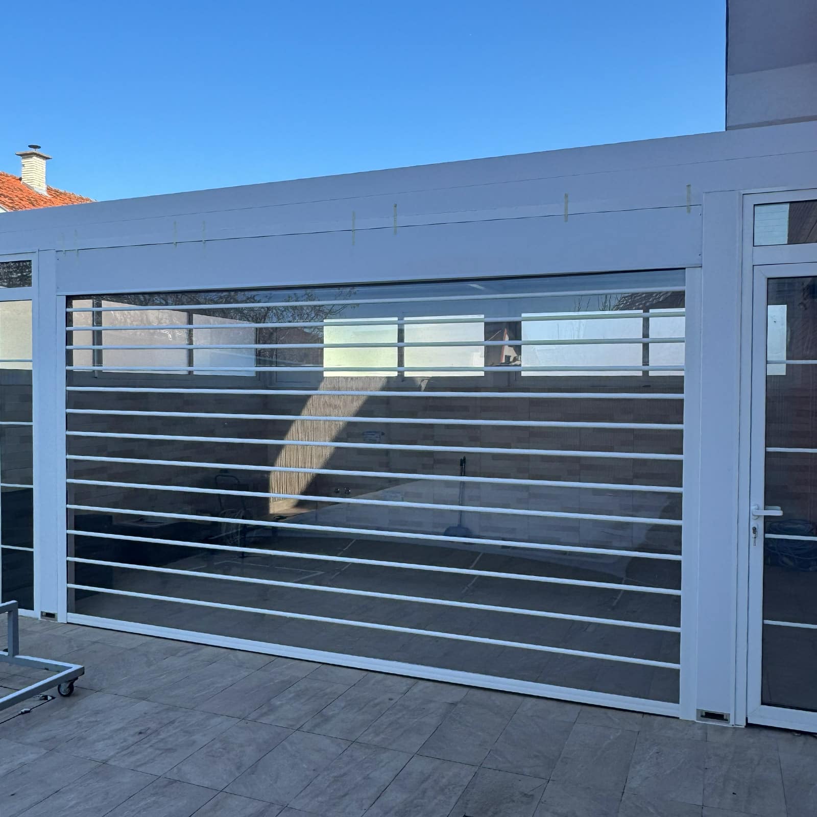 Polikarbonatni paneli pružaju otpornost na spoljašnje uticaje i dugotrajnu upotrebu, dok metalni elementi obezbeđuju stabilan rad sistema i precizno vođenje vrata tokom podizanja i spuštanja. Motorni pogon sa daljinskim upravljanjem dodatno unapređuje komfor korišćenja i svakodnevnu praktičnost.